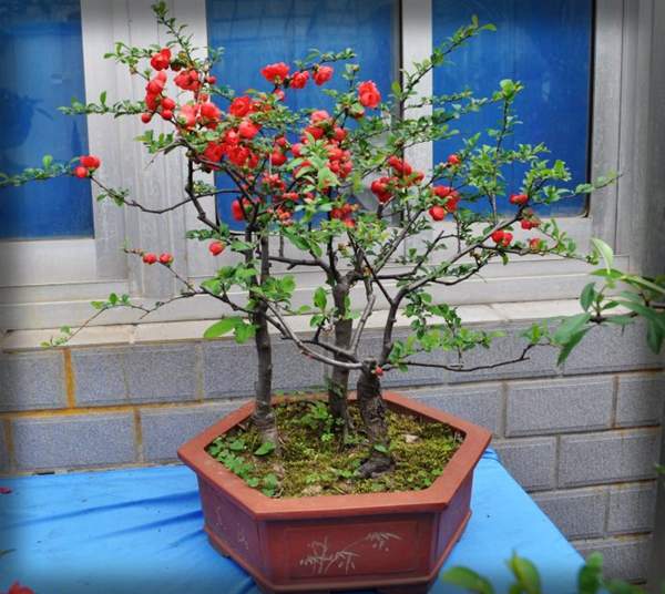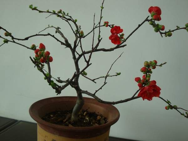 貼梗海棠它又叫作皺皮木瓜,而且還有許多的叫法,是落葉灌木的一種,它在園林綠化上屬于觀花、觀果的優良品種;特別是在花期的時候,滿樹花朵非常的艷麗,顏色多樣;貼梗海棠不但在園林效應上有它的風采,而且它的果實還可以吃,果實營養豐富含維生素多,在醫學上也有它的獨特功效;貼梗海棠在綠化上可以栽種在景區、道路兩邊、庭院等地方;還可以在一些綠化樹中栽種一兩棵貼梗海棠,可以起到點綴的效果,成片的栽種也有不一樣的觀賞效果;它不僅可以地栽也可以制作為盆景,造型多種,常被放置在客廳、花臺、陽臺、門庭邊都可以,下面我們就來欣賞一下它的各種造型盆景吧: